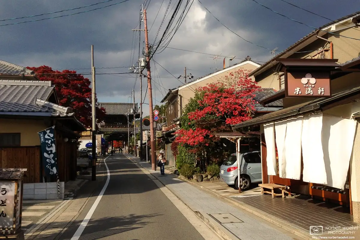 The approach to Seiryoji leads along a road traversing a pleasant residential area with some small shops, …