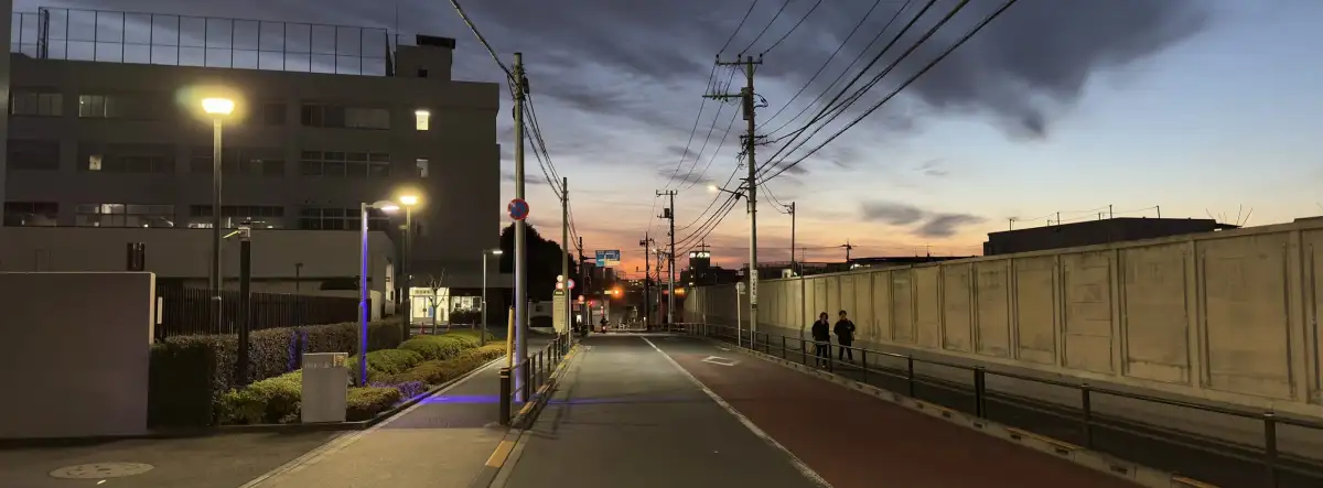 A suburban Tokyo scenery at dusk in December - buildings, roads and a red color gradation in the sky.