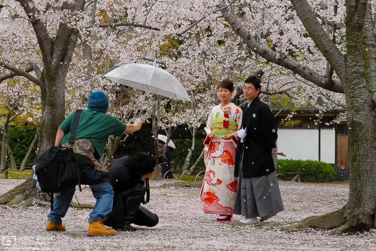 Not far away from Okayama Castle, on the opposite side of the Asahi River, is Korakuen, known as one of the “Three Great Gardens of Japan”. I ran into a photoshoot that was just taking place amidst a shower of falling cherry blossoms.