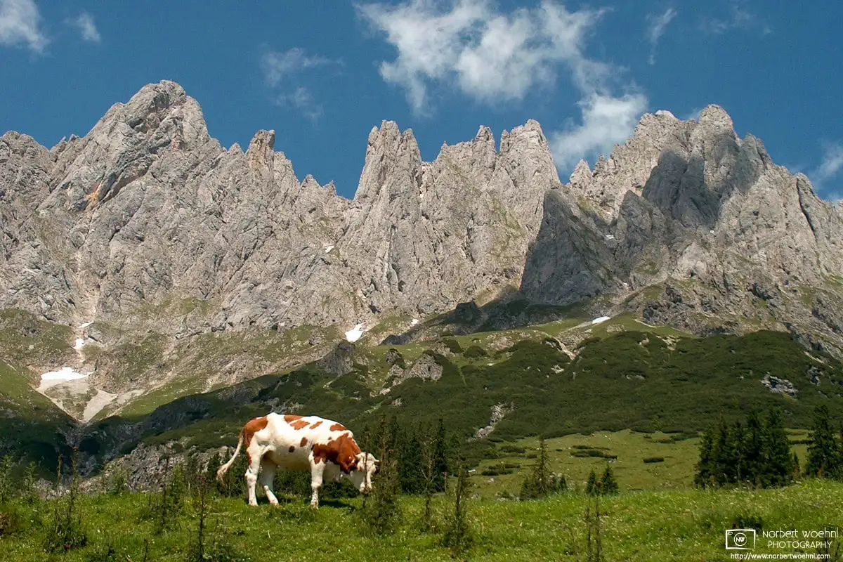 A brown-and-white Salzburg cow grazing below the rocky peaks called Mandlwand, which are part of the Hochkönig mountain range in the Austrian state of Salzburg.