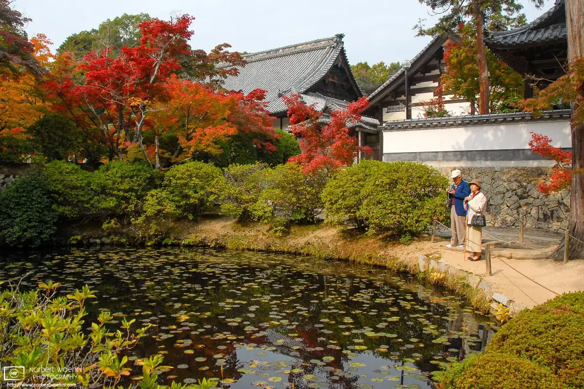 An elderly couple enjoys a quiet moment by the pond on a fine autumn day at Hōfukuji Temple in Sōja, Okayama Prefecture, Japan.