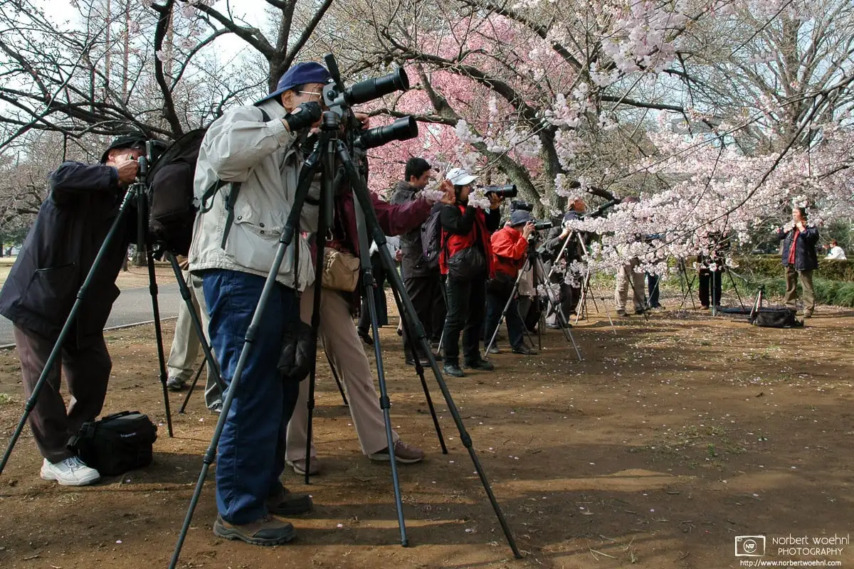 Photographers using heavy gear to take pictures of cherry blossoms at Shinjuku Gyoen in Tokyo, Japan.