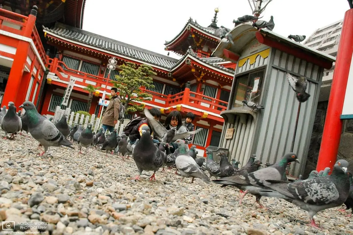 Kids playing with pigeons at Osu Kannon Temple in Nagoya, Japan.