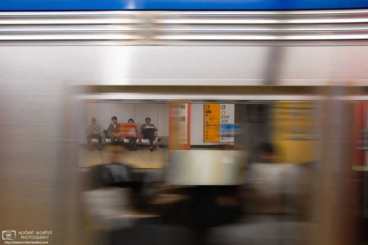 Photo taken through the windows of an arriving subway train in Tokyo, Japan.