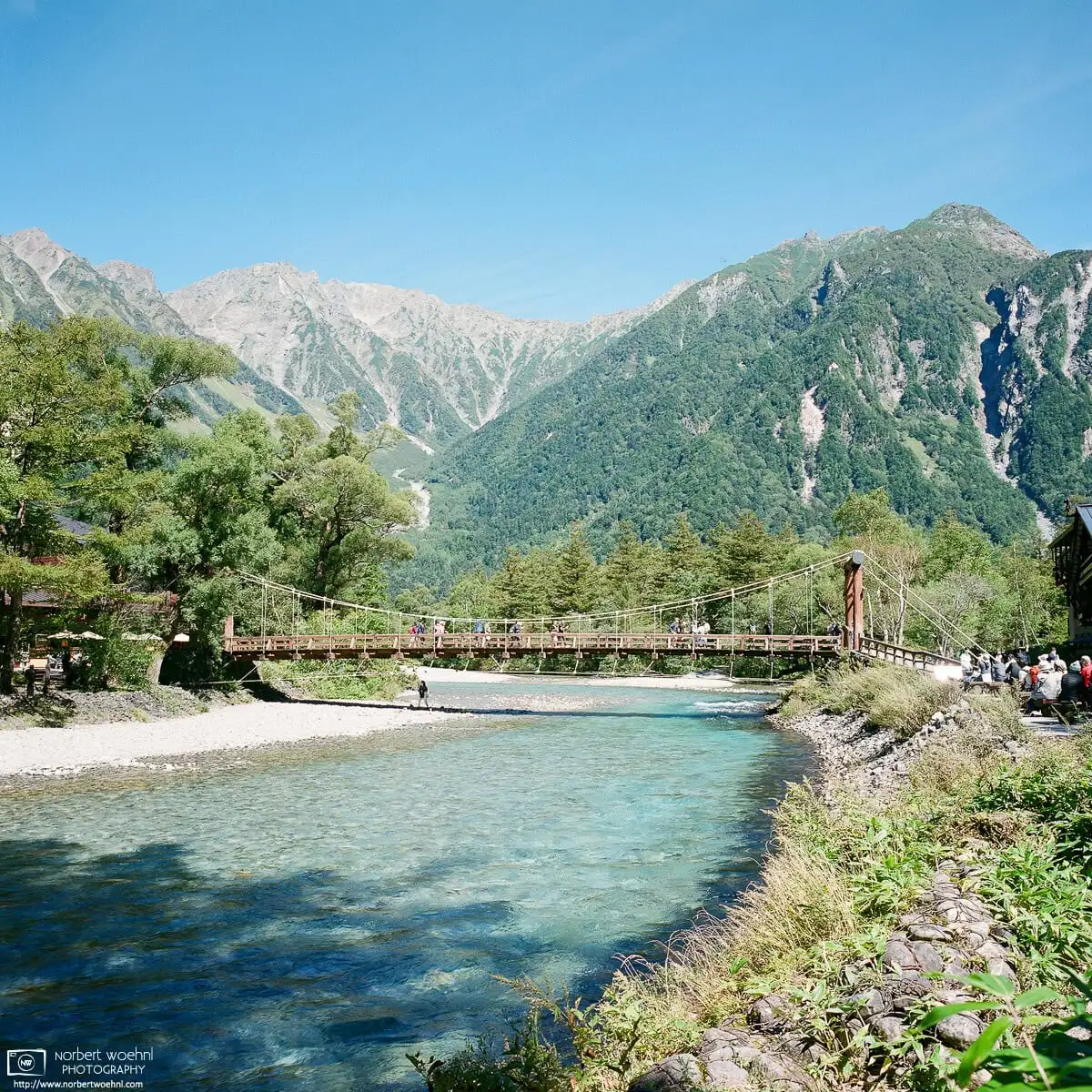 Kappa Bridge is crossing the Azusa River at Kamikōchi, a mountainous highland valley in the western part of Nagano Prefecture, Japan.