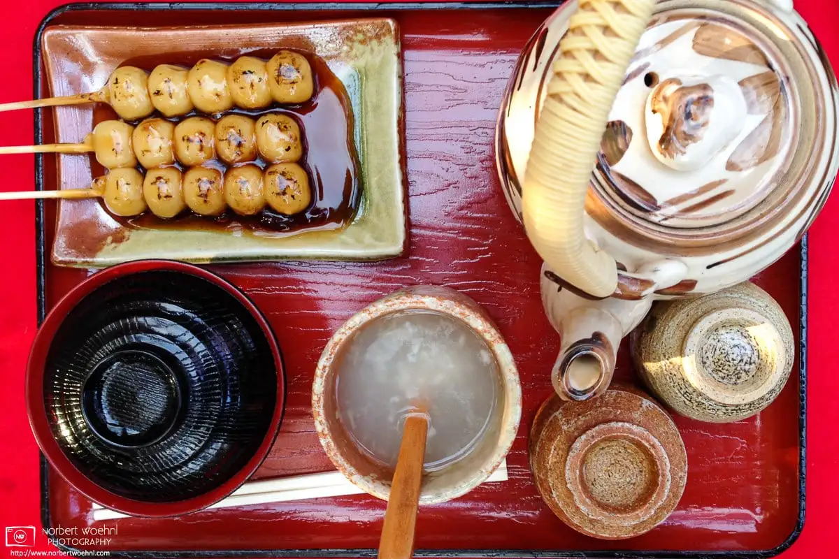 A tray of autumnal snacks (dango, amazake, tea and miso soup) at Eikando Zenrinji Temple in eastern Kyoto, Japan.