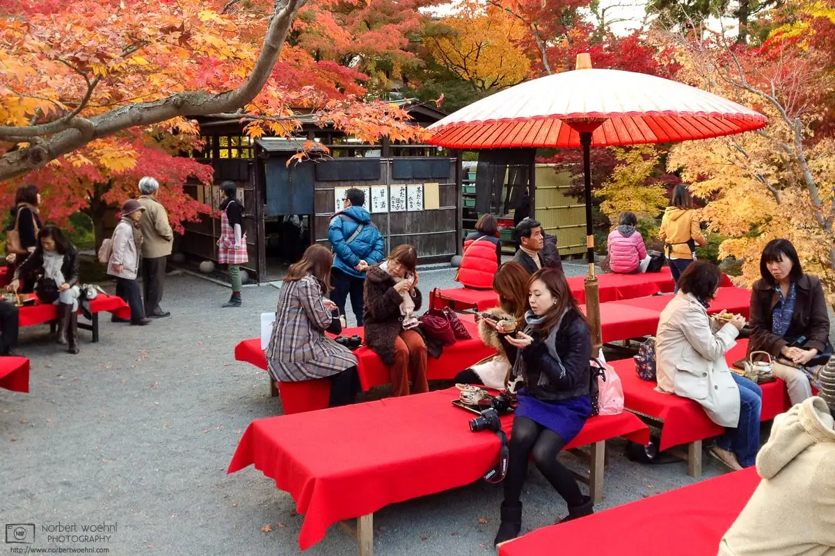 During autumn season, many temples in Japan offer these kind of snacks, or a slightly modified local variety. There are usually seating areas such as the one shown below, allowing to savor the food and drink while enjoying the splendid colors of nature.