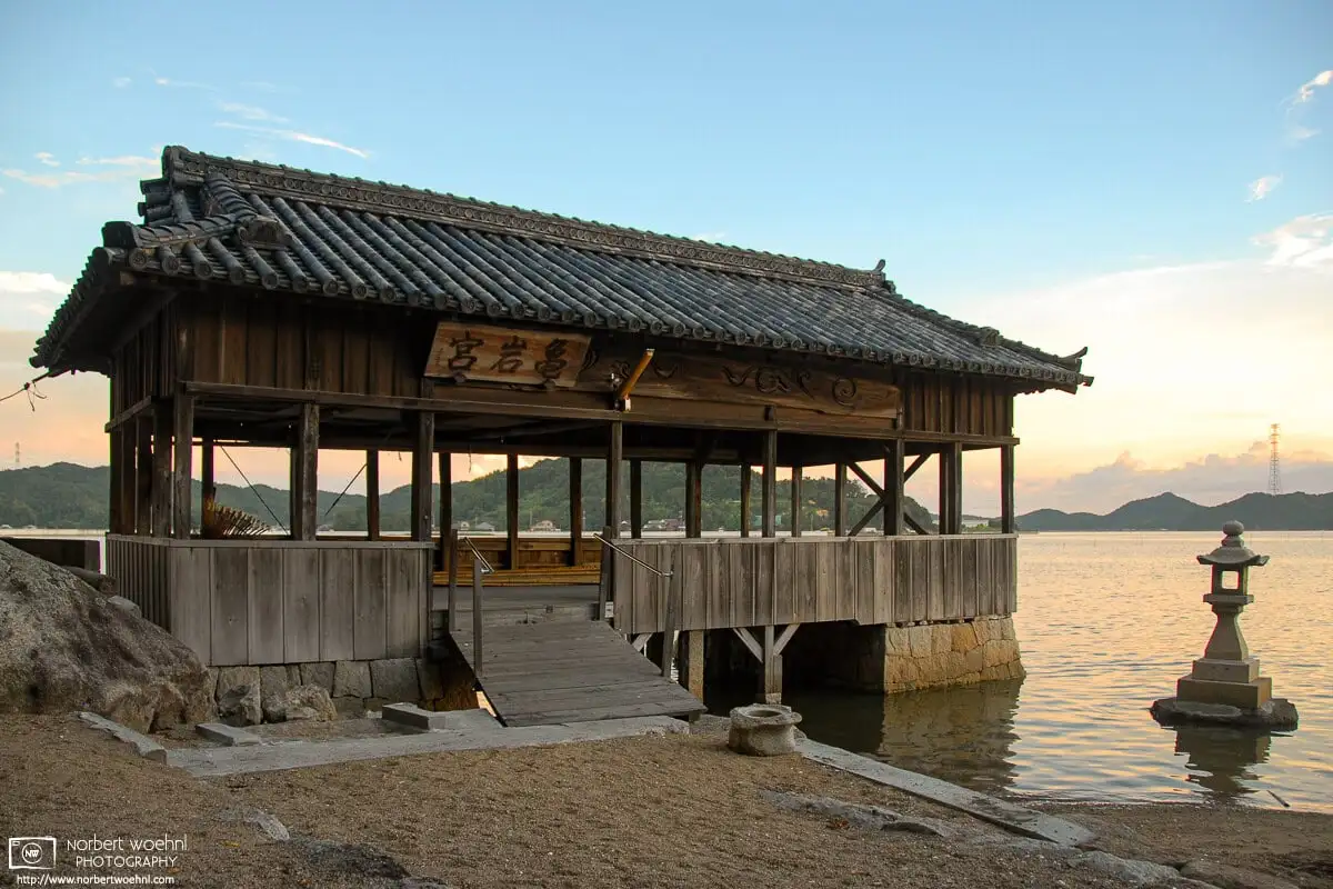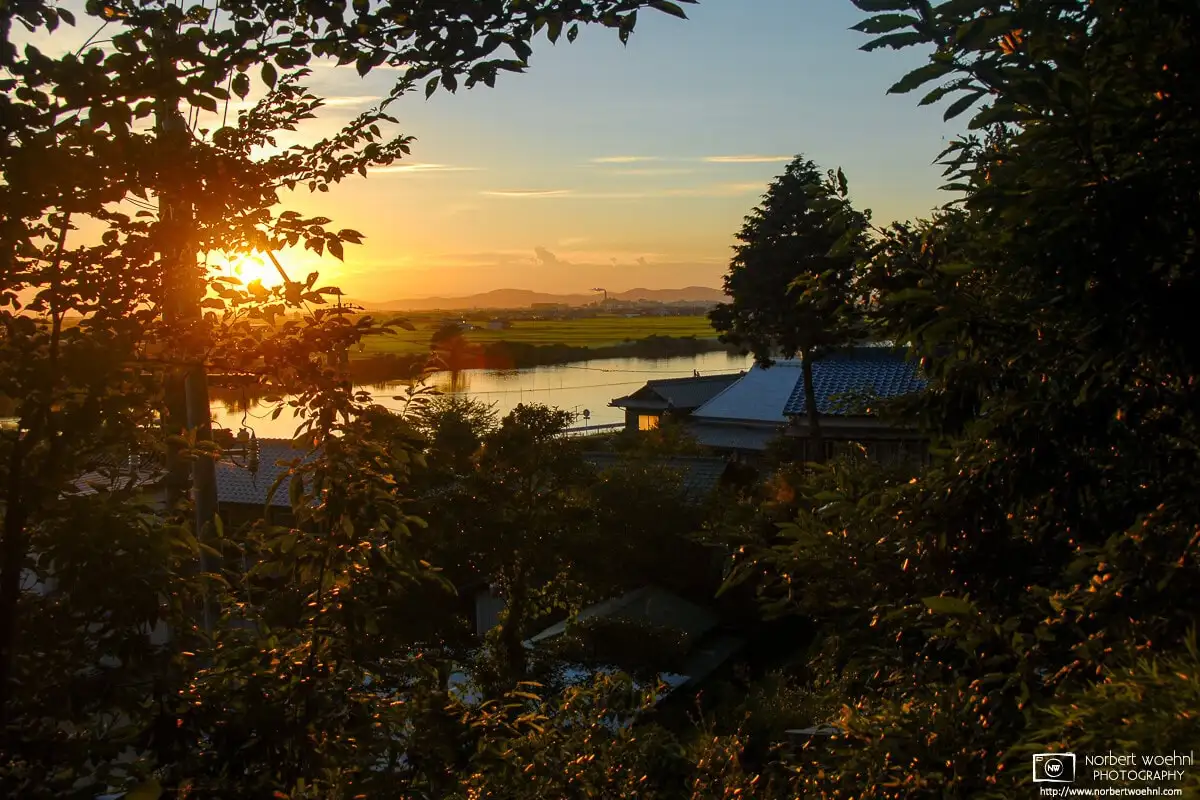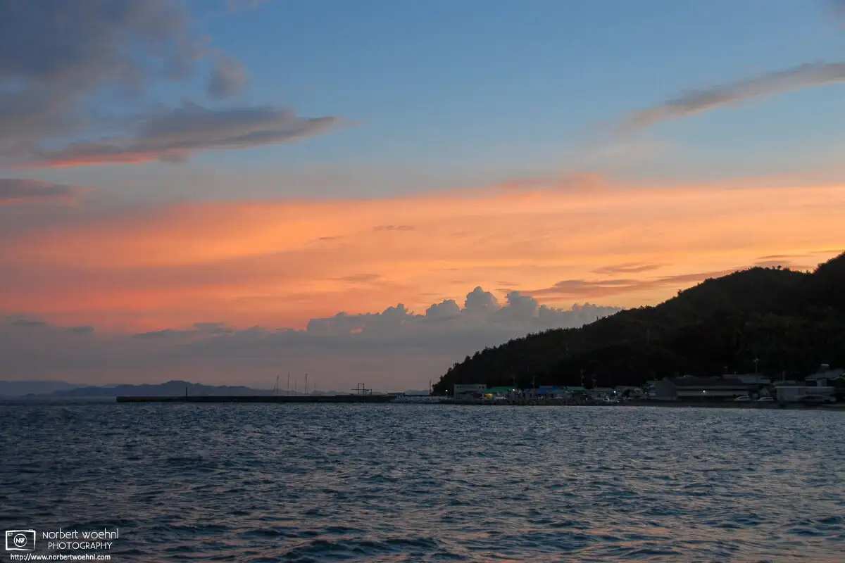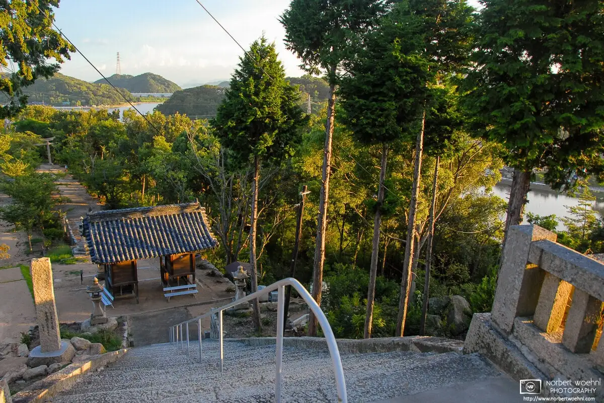 A series of photos taken on a hot summer evening around Suimon Bay east of Okayama City, Japan, including a visit to an Inari Shrine and an ocean viewpoint.