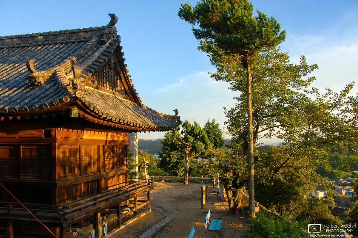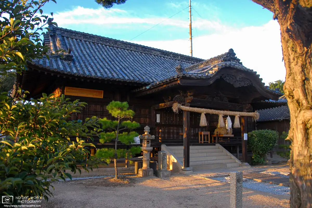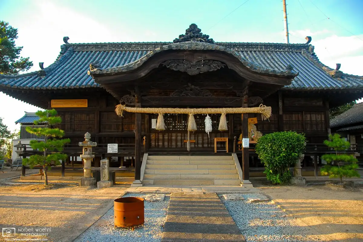 Summer evening view of buildings belonging to Kameiwa Shrine east of Okayama City, Japan.